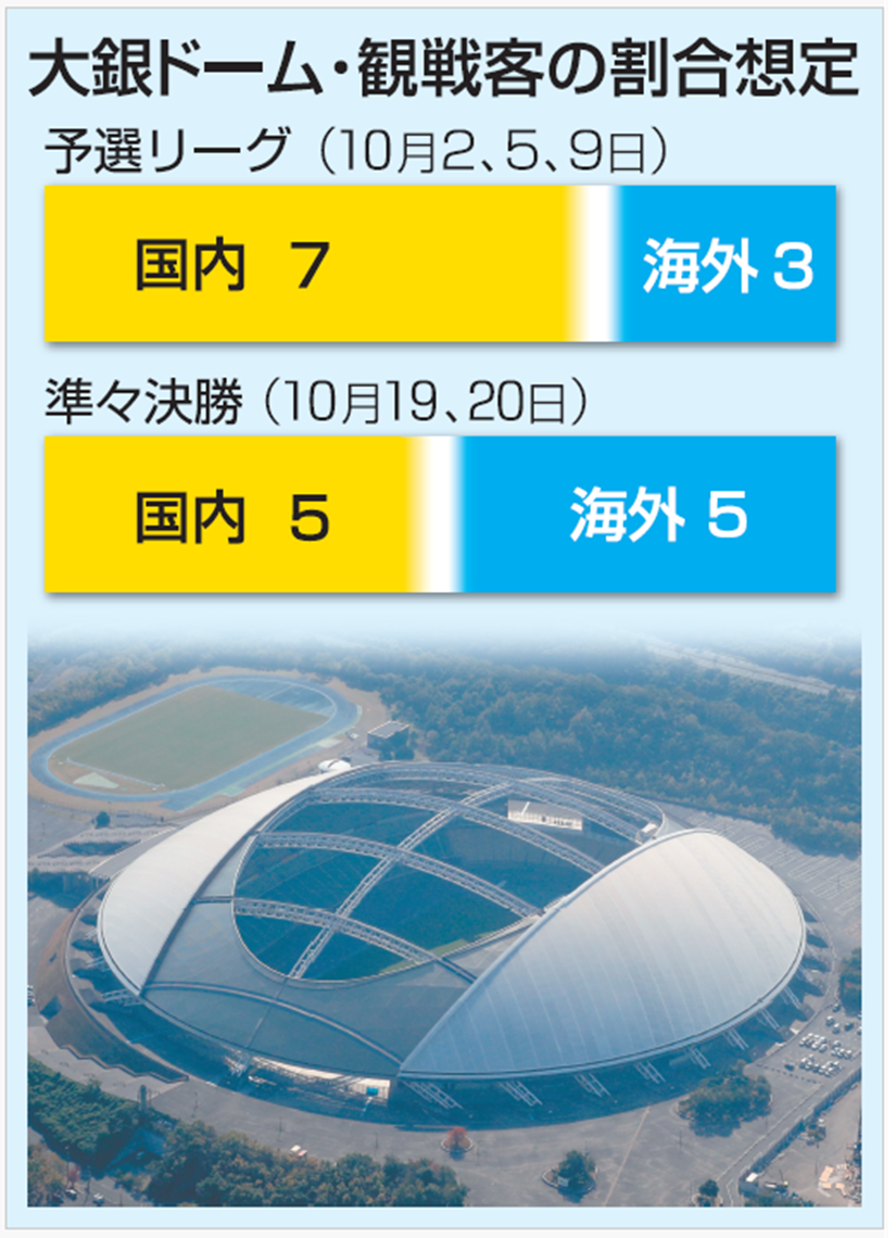 今秋のラグビーワールドカップ(W杯)日本大会で、大分市の大分銀行ドームが会場となる計5試合について、観戦客の半数近くを海外客が占める可能性のあることが27日、県への取材で分かった。英国を中心とした欧州・オセアニアからの来県者は10万人も視...