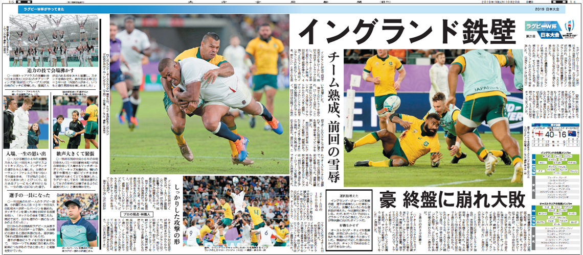 ラグビーワールドカップ(W杯)日本大会の準々決勝1試合が19日、大分市の昭和電工ドーム大分であった。世界ランキング3位のイングランドと同6位のオーストラリアが対戦。...