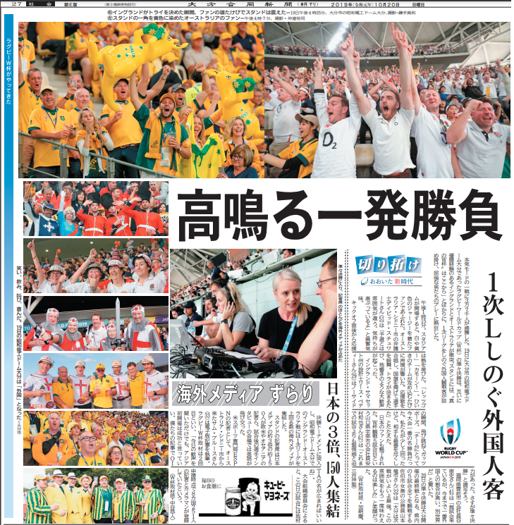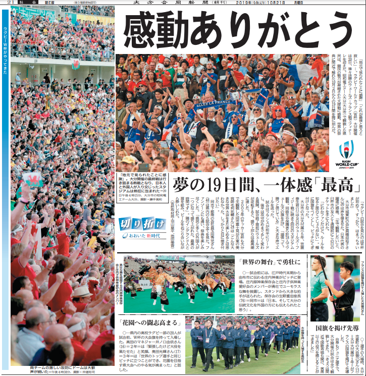 ラグビーW杯は大分県に何をもたらすのか。新しい時代を歩む大分の“これから”を追う年間企画「切り拓(ひら)け~おおいた新時代」。1次リーグ3試合と準々決勝2試合の計5試合を開催した「OITA」は海外から多くの観戦者が訪れ、大会期間中は熱狂に沸いた。W杯フィーバーの日々を各記者が記録し、長期連載では、世界的なスポーツイベントを地方都市で受け入れる意味と意義を考えた。