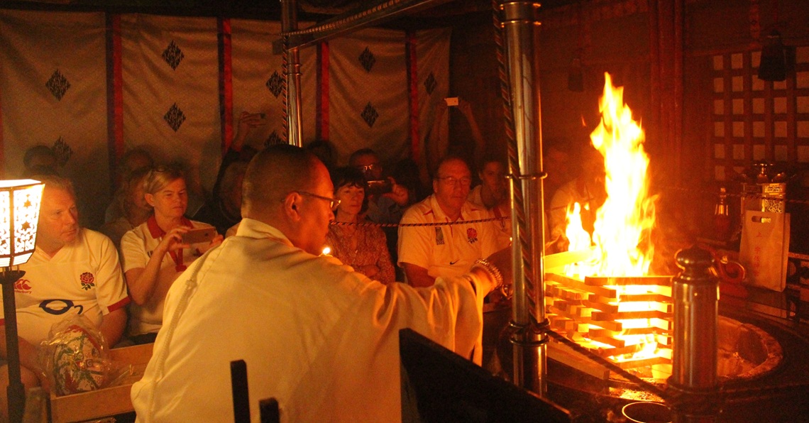 国東市国東町大恩寺の文殊仙寺で19日、英国からの観光客が護摩焚(だ)きを体験し、ラグビーワールドカップでイングランドとウェールズの必勝を祈願した。...