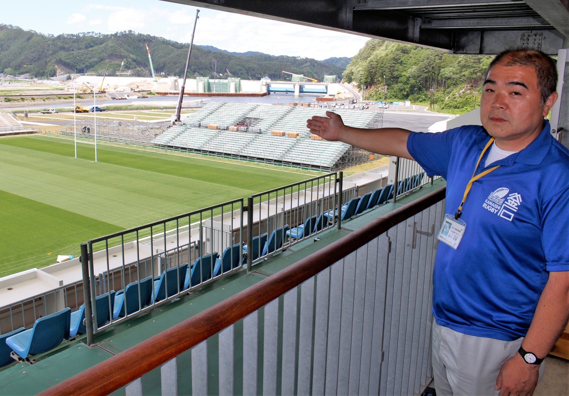 三陸の海と山に向き合う大地に、よく手入れされた芝が映える。 6月中旬。岩手県釜石市の釜石鵜住居(うのすまい)復興スタジアムは、秋のラグビーワールドカップ(W杯)に向けて仮設席の設置工事が進んでいた。 「新たな聖地になってほしい」。...