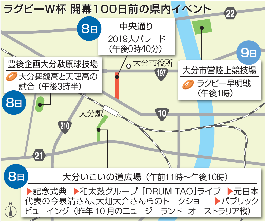 アジア初開催となる今秋のラグビーワールドカップ(W杯)日本大会は12日に開幕まで100日となる。県推進委員会などは直前の週末の8、9の両日、大分市内で大々的なカウントダウンイベントを企画。世界を迎え入れるホストシティー(開催都市)として、...