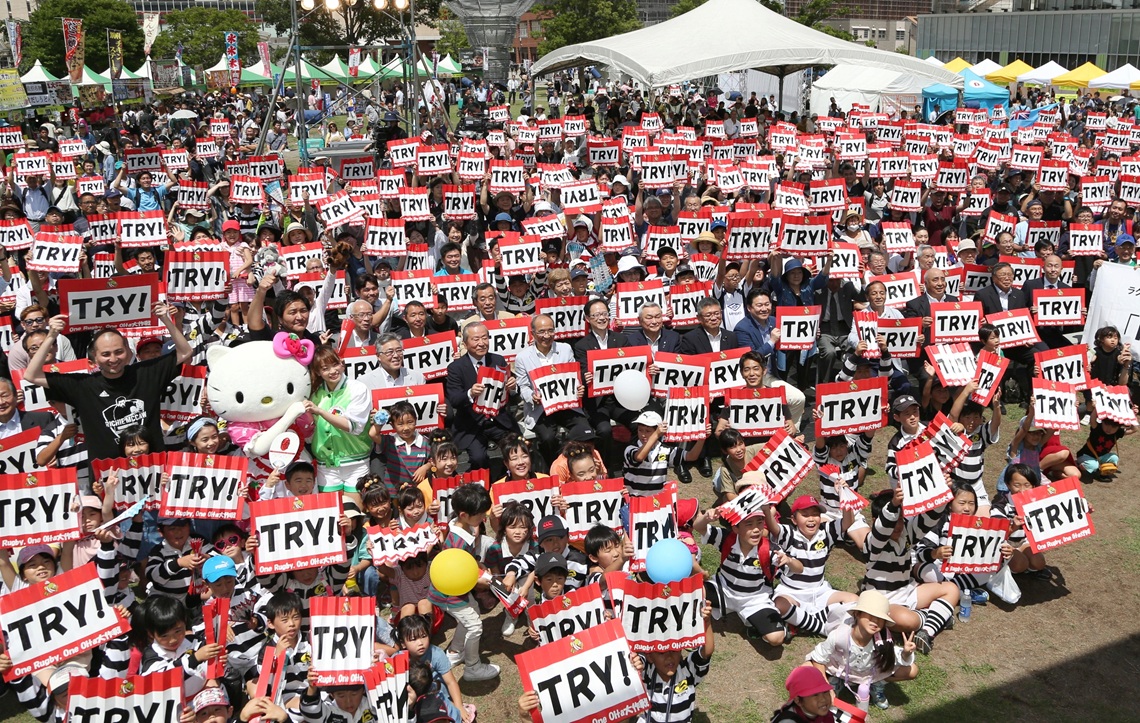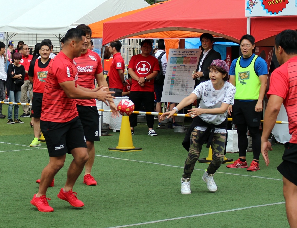 九州一の繁華街に子どもたちの元気な声が響く。 6月15日。福岡市役所前の広場に、ラグビーワールドカップ(W杯)の開幕100日前にちなんだイベント会場が登場した。 市内の企業チーム「コカ・コーラレッドスパークス」の選手が市民と3対3...