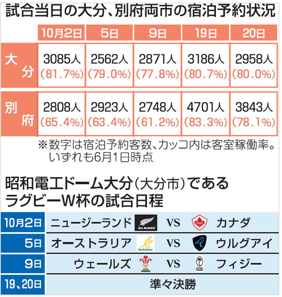 県は21日、今年10月のラグビーワールドカップ(W杯)大分開催期間中の県内の宿泊予約状況を発表した。大会まで残り3カ月余りで客室はすでに半数近くが埋まり、試合会場の大分市は約8割、隣接する別府市も7割近くに達する。特に試合のある5日間に、...