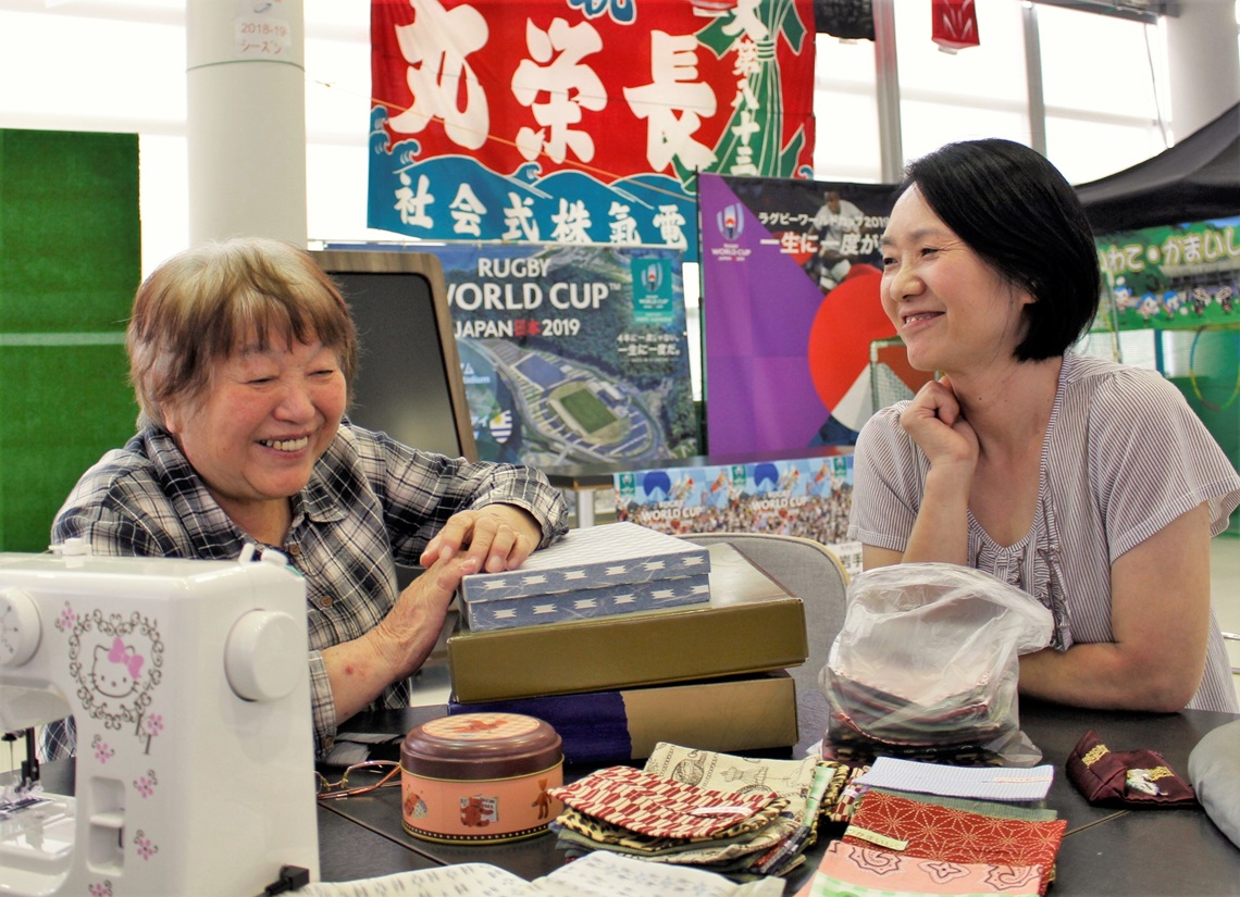 多彩な柄の布がテーブルに積まれている。 6月17日の昼下がり。岩手県釜石市内の公共施設に設けられた交流拠点「ラグビーカフェ釜石」を訪ねると、地元の徳増初子(68)と広田美奈子(56)がミシンに向かっていた。 端切れを縫い、「かまい...
