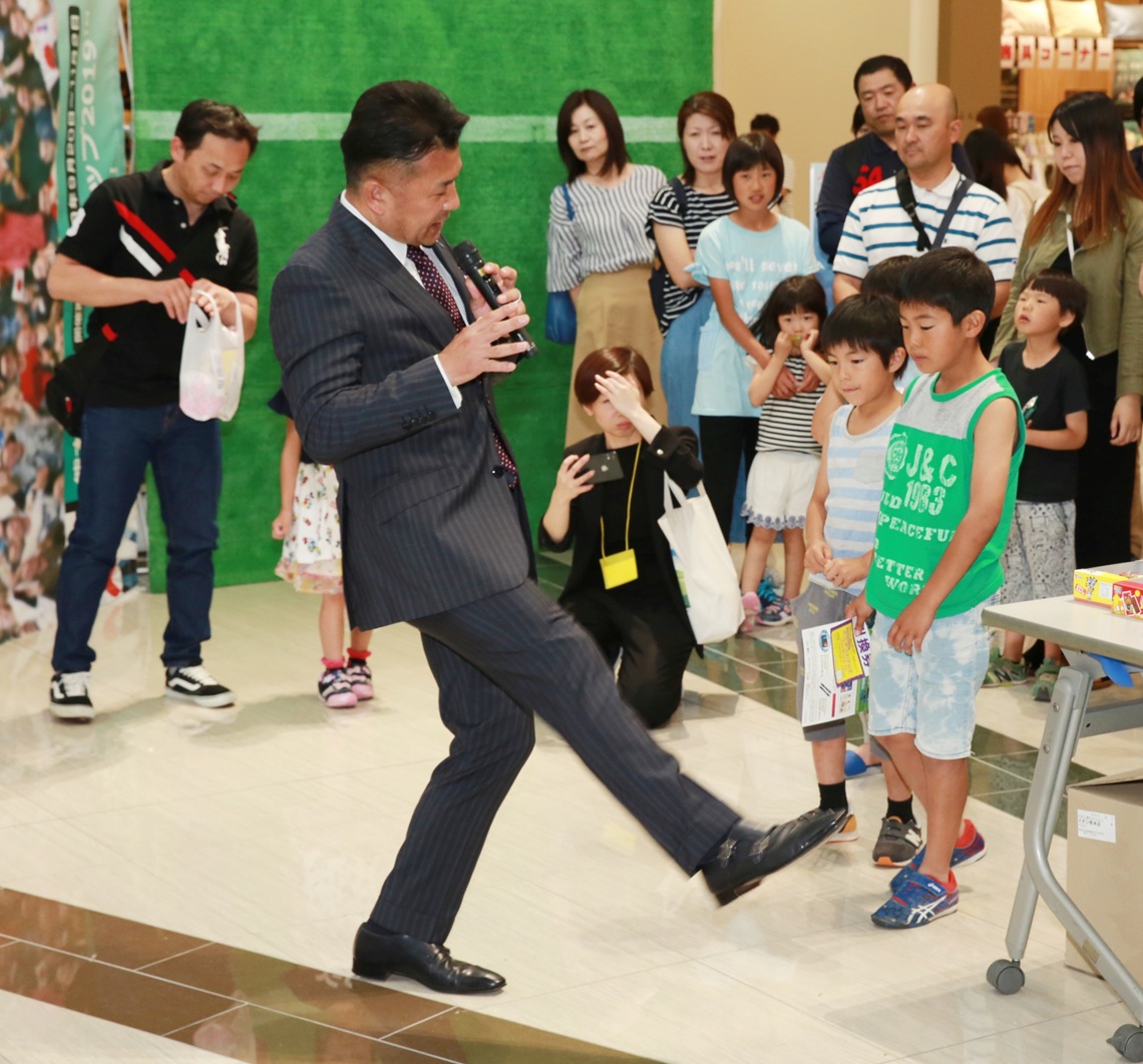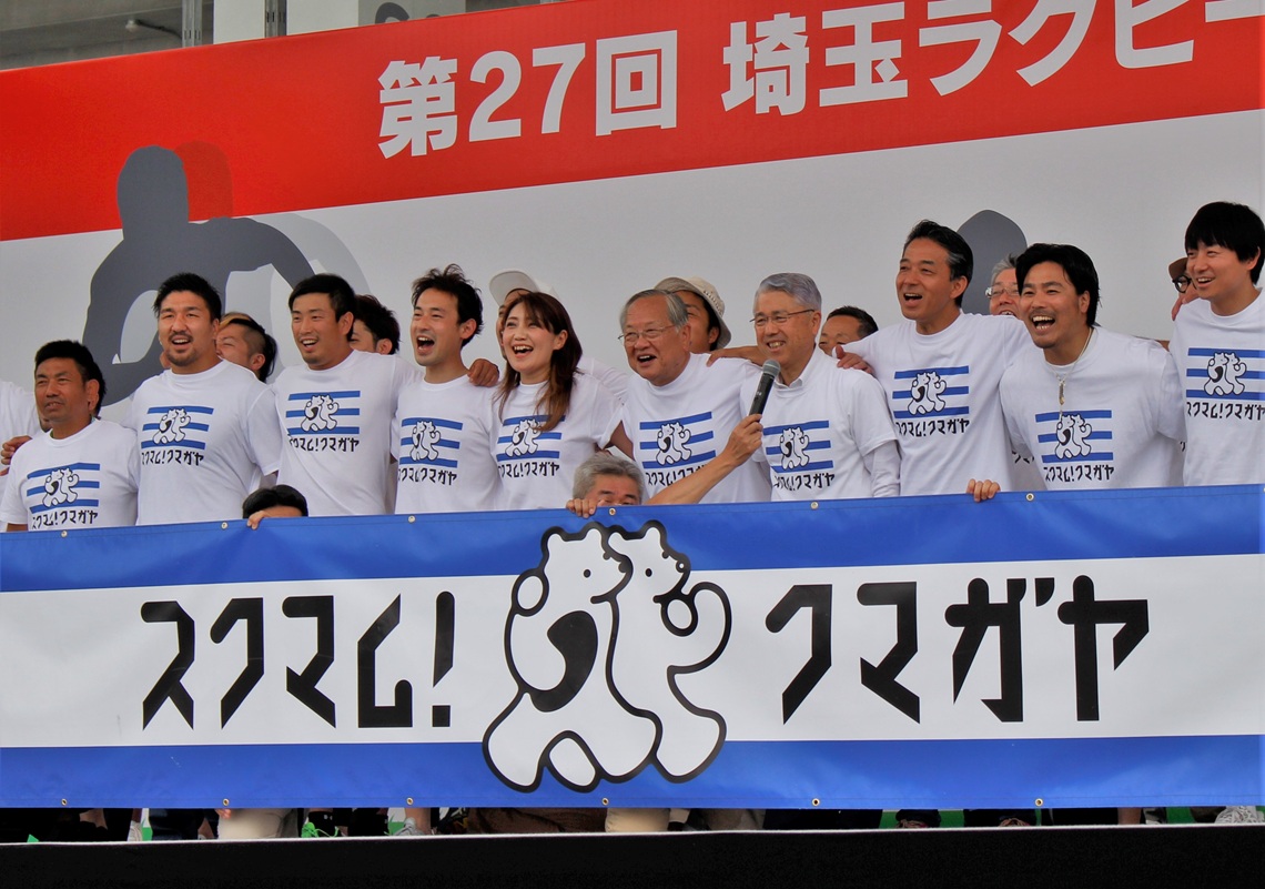 <国際スポーツイヤーがやってくる!>――。買い物客の頭上で垂れ幕が踊る。 5月下旬の休日。熊本県嘉島町のショッピングモールでは、元ラグビー日本代表の吉田義人(よしひと)(50)がゴールキックを実演していた。地元開催のワールドカップ(W...