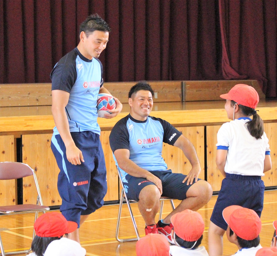 「よろしくお願いします!」。浜松市の東小体育館に5、6年生110人の声が響いた。 6月上旬。「先生」を務めたのは、隣の静岡県磐田市に拠点を置くラグビートップリーグチーム「ヤマハ発動機ジュビロ」の所属選手、五郎丸歩(33)と山村亮(37...