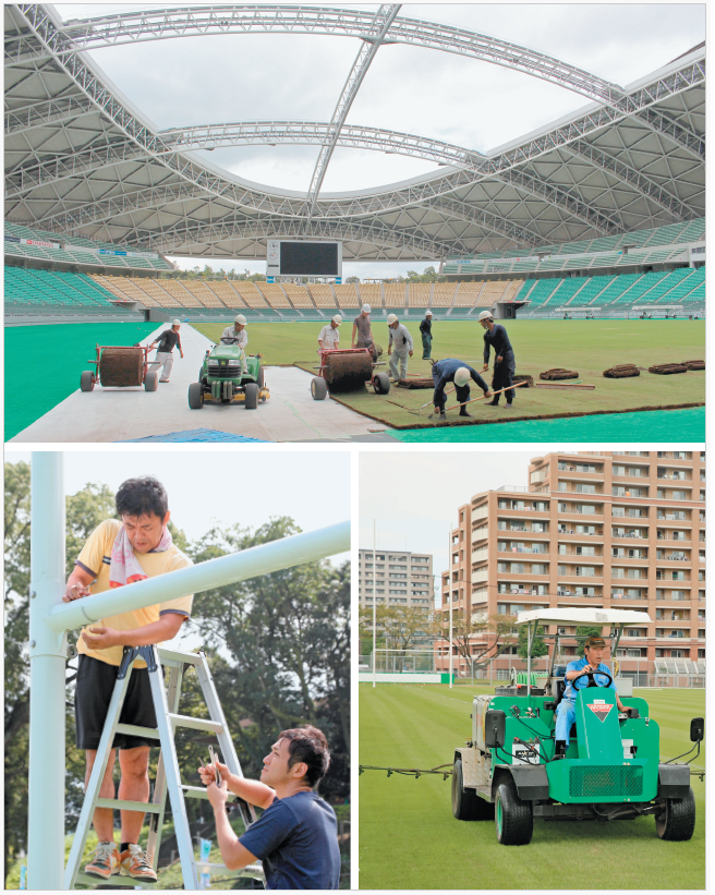 作業員がシート状の芝を敷き詰めていく。鮮やかな緑がスタンド間際に迫る。 大分市横尾の昭和電工ドーム大分で11日、ピッチの四方に天然芝を継ぎ足し、その周囲を人工芝で埋める工事が始まった。 ラグビーワールドカップ(W杯)日本大会は、1...