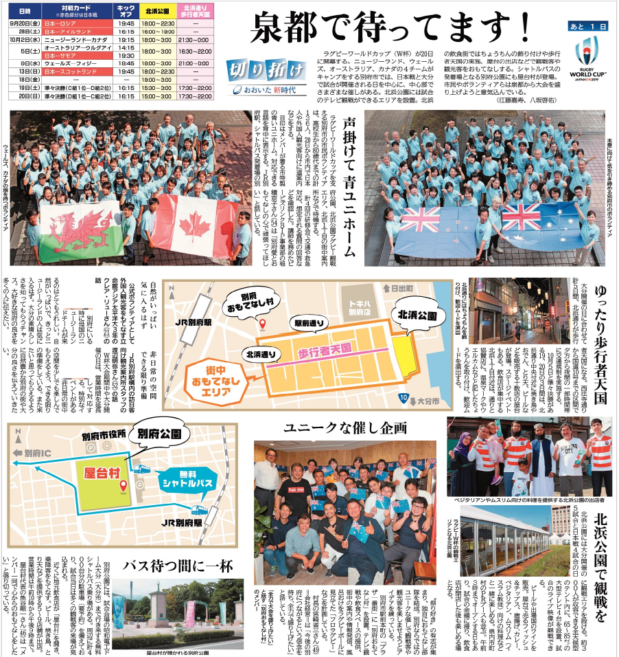 ラグビーW杯は大分県に何をもたらすのか。新しい時代を歩む大分の“これから”を追う年間企画「切り拓(ひら)け~おおいた新時代」。1次リーグ3試合と準々決勝2試合の計5試合を開催した「OITA」は海外から多くの観戦者が訪れ、大会期間中は熱狂に沸いた。W杯フィーバーの日々を各記者が記録し、長期連載では、世界的なスポーツイベントを地方都市で受け入れる意味と意義を考えた。