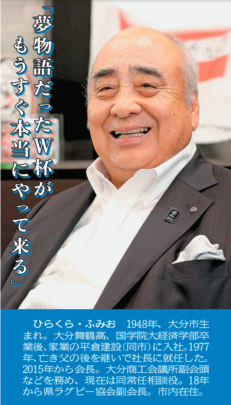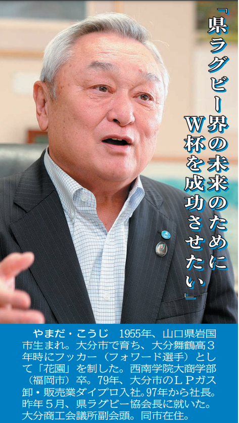 山田耕司・県ラグビー協会長(63) ――大分がラグビーワールドカップ(W杯)日本大会の開催地に立候補したのは2014年秋だった。 「県と県協会が『相乗り』して準備することが成功の道だと信じてきた。機運醸成に向けて考えたのは『まず...