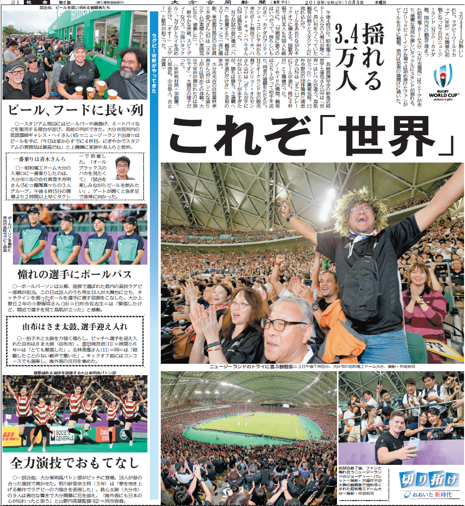 ラグビーW杯は大分県に何をもたらすのか。新しい時代を歩む大分の“これから”を追う年間企画「切り拓(ひら)け~おおいた新時代」。1次リーグ3試合と準々決勝2試合の計5試合を開催した「OITA」は海外から多くの観戦者が訪れ、大会期間中は熱狂に沸いた。W杯フィーバーの日々を各記者が記録し、長期連載では、世界的なスポーツイベントを地方都市で受け入れる意味と意義を考えた。