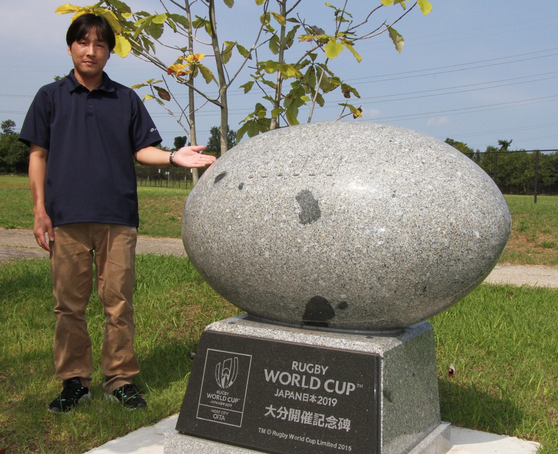 ラグビーワールドカップ(W杯)の試合会場がある大分市の大分スポーツ公園に、御影石製のラグビーボールが飾られている。...