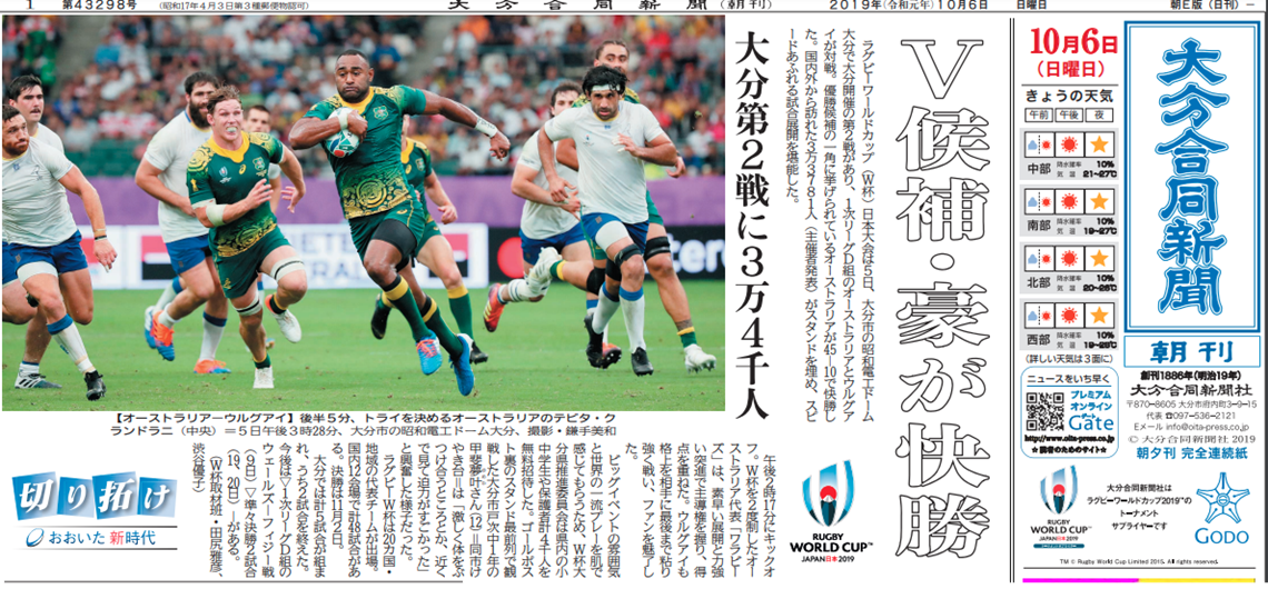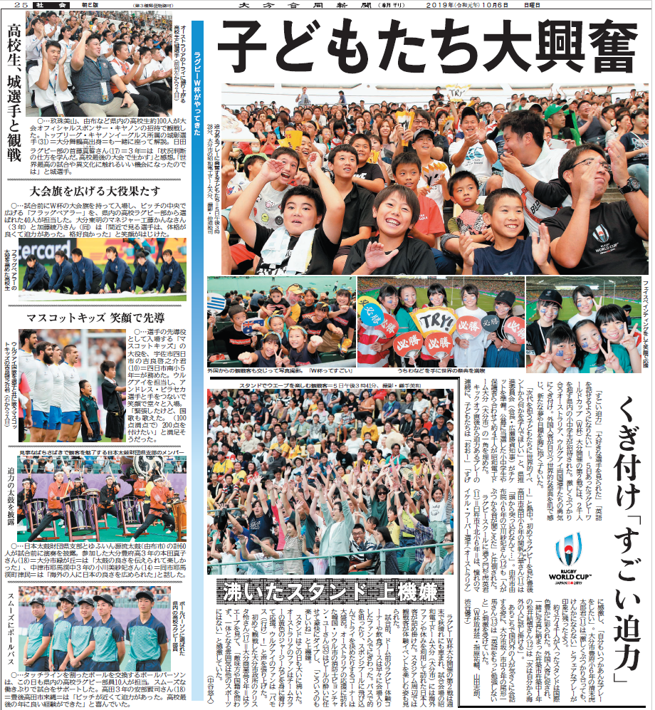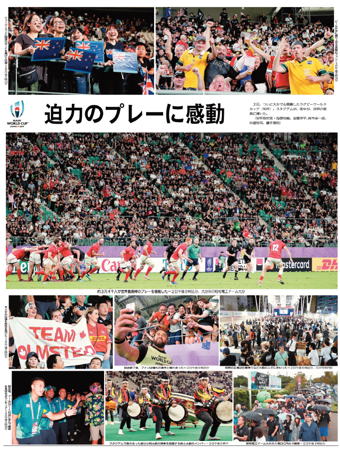 ラグビーW杯は大分県に何をもたらすのか。新しい時代を歩む大分の“これから”を追う年間企画「切り拓(ひら)け~おおいた新時代」。1次リーグ3試合と準々決勝2試合の計5試合を開催した「OITA」は海外から多くの観戦者が訪れ、大会期間中は熱狂に沸いた。W杯フィーバーの日々を各記者が記録し、長期連載では、世界的なスポーツイベントを地方都市で受け入れる意味と意義を考えた。