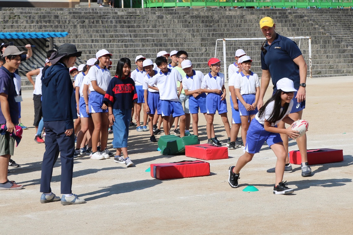 ラグビーの元オーストラリア代表選手によるラグビー教室が4日、別府市の朝日小であった。...