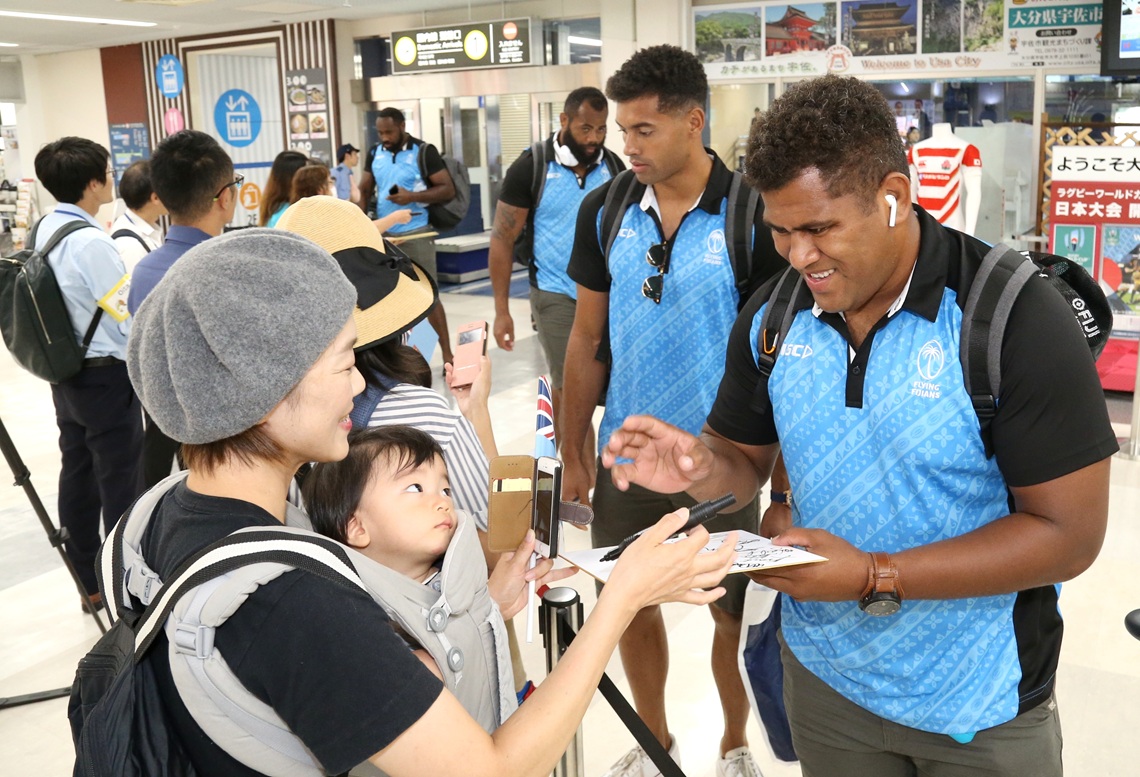 ラグビーW杯大分開催の第3戦でウェールズと戦うフィジー代表が7日午後、空路で県入りした。...