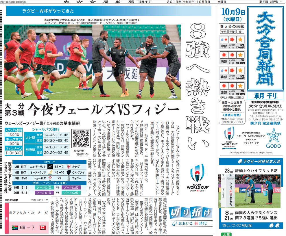 ラグビーワールドカップ(W杯)日本大会はきょう9日、大分市横尾の昭和電工ドーム大分で1次リーグD組のウェールズ―フィジー戦がある。大分開催の第3戦となり、キックオフは午後6時45分。実力のあるチーム同士の好カードで、いずれも決勝トーナメン...