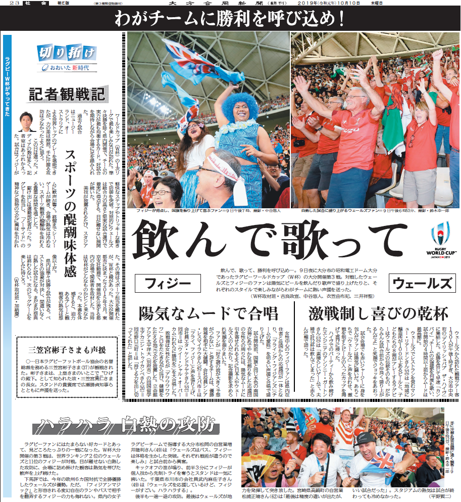 ラグビーW杯は大分県に何をもたらすのか。新しい時代を歩む大分の“これから”を追う年間企画「切り拓(ひら)け~おおいた新時代」。1次リーグ3試合と準々決勝2試合の計5試合を開催した「OITA」は海外から多くの観戦者が訪れ、大会期間中は熱狂に沸いた。W杯フィーバーの日々を各記者が記録し、長期連載では、世界的なスポーツイベントを地方都市で受け入れる意味と意義を考えた。