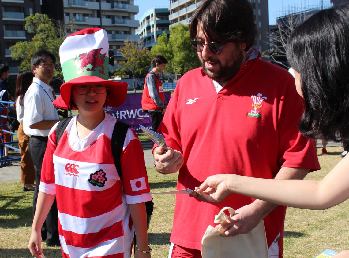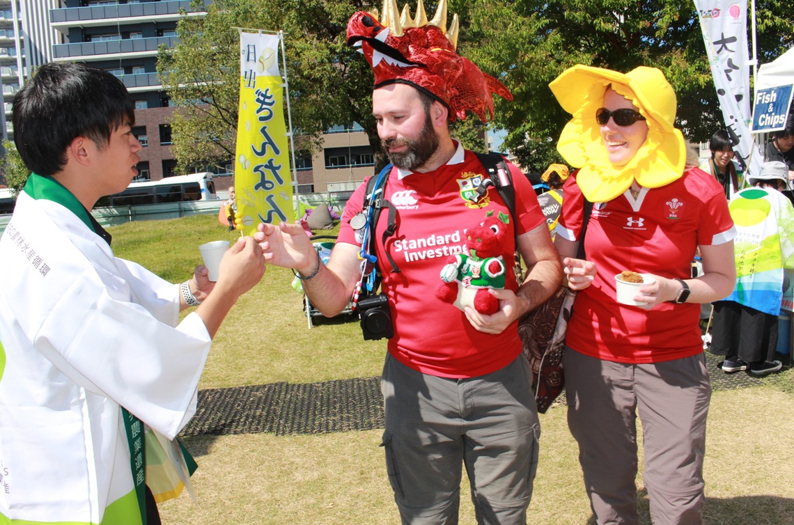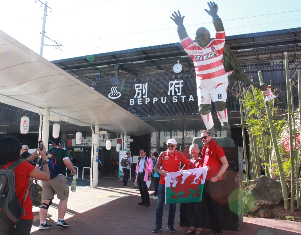ラグビーワールドカップ(W杯)のウェールズ―フィジー戦(9日・大分市)観戦のため、ウェールズから別府市に来た約80人を迎えるセレモニーが同日、市内のホテルであった。...