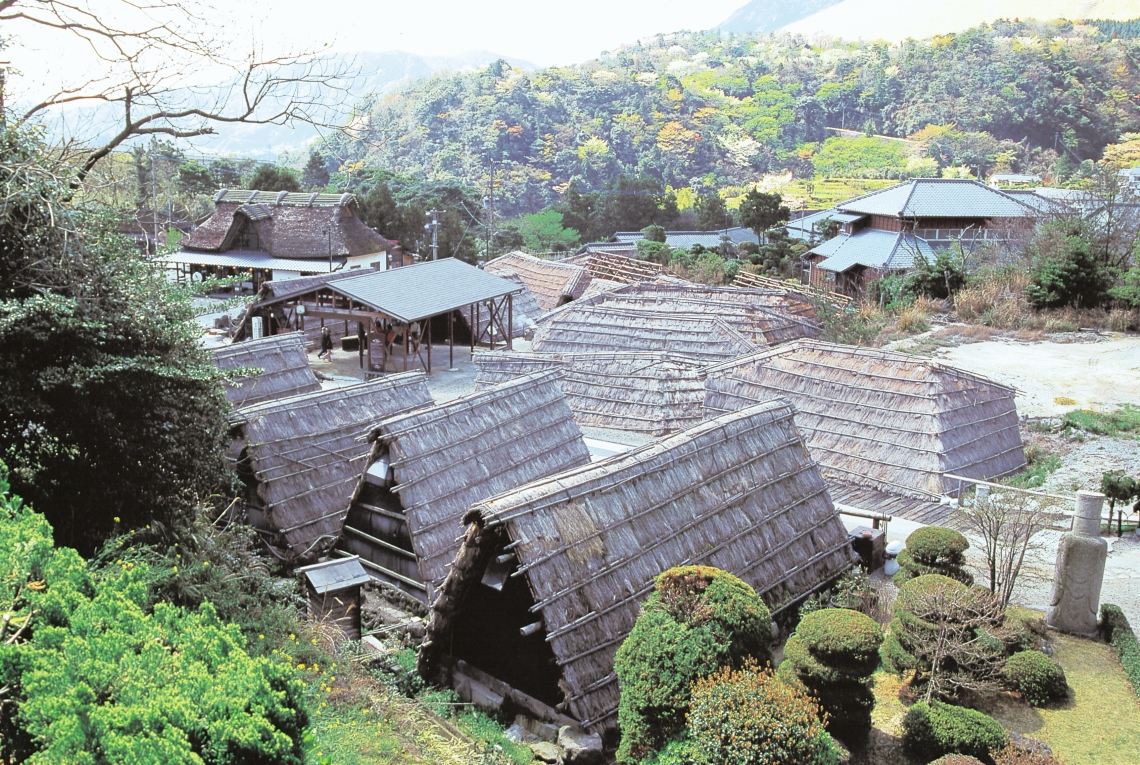 別府市街地から国道500号を十文字原に向けて上り、高速道路の高い橋の下を抜けると強いにおいがしてくる。別府八湯の1つで、最も奥まった明礬温泉である。 においは湯の花小屋からのもの。道の両側や一帯にかけて、古代住居を思わせるワラぶきの三...
