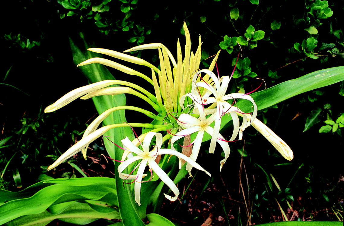 ハマユウ(浜木綿)は「黒潮の楽園」の代表的な植物。関東以南の太平洋沿岸、つまり黒潮洗う暖かい南海型気候区の砂浜に自生する。大分県内では佐伯市の蒲江、米水津に多く、夏の花時は潮風に揺れる白い貴婦人といった風情である。 ヒガンバナ科の多年...