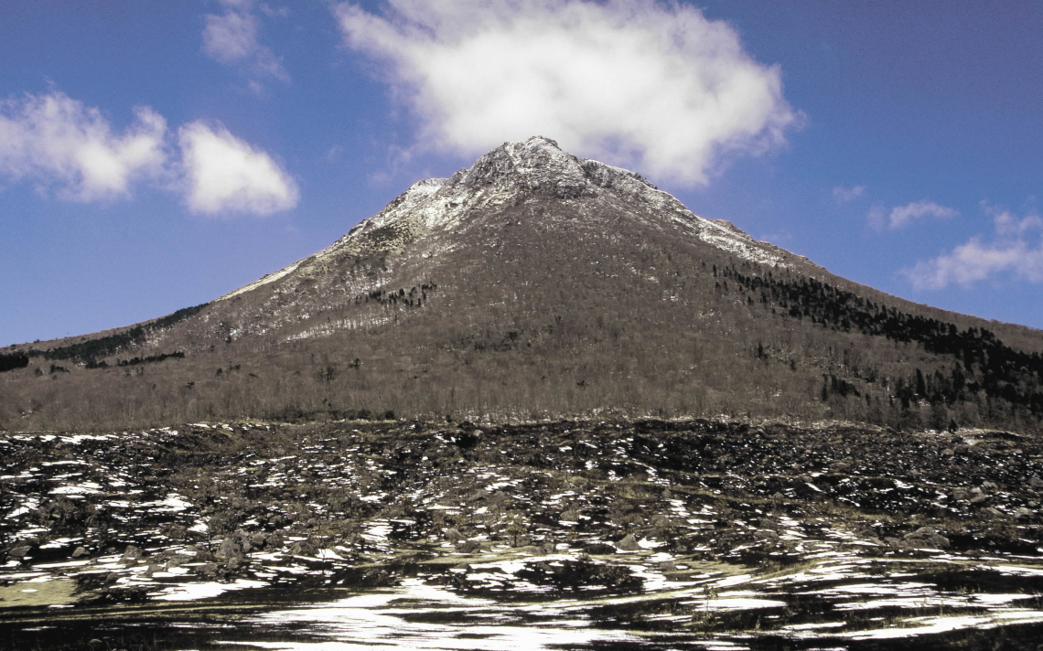 由布岳(標高1583m)は豊後富士とも呼ばれ、大分県の代表的な名山。ただ、駿河の富士山と同じく独立峰ではあるが、コニーデ型の長く裾(すそ)を引く山容ではなく、くじゅう山群や隣の鶴見岳などとともにトロイデ型の鐘状火山である。 東西2つの...