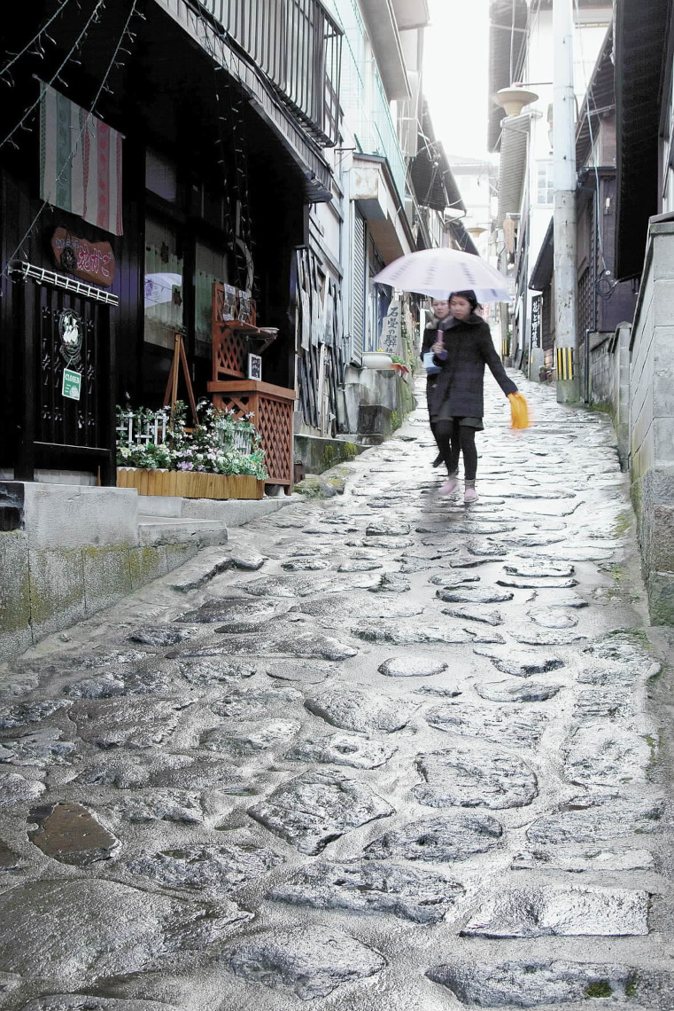 湯平温泉といえば石畳。緩やかな坂はおよそ500mにわたる。両側にはびっしりと湯宿や土産品店。金の湯、銀の湯、中の湯など五つの共同浴場も。花合野(かごの)川の瀬音とともに、カランコロンと湯治客のげたの音が伝わってくる。雨もよく似合う。 ...