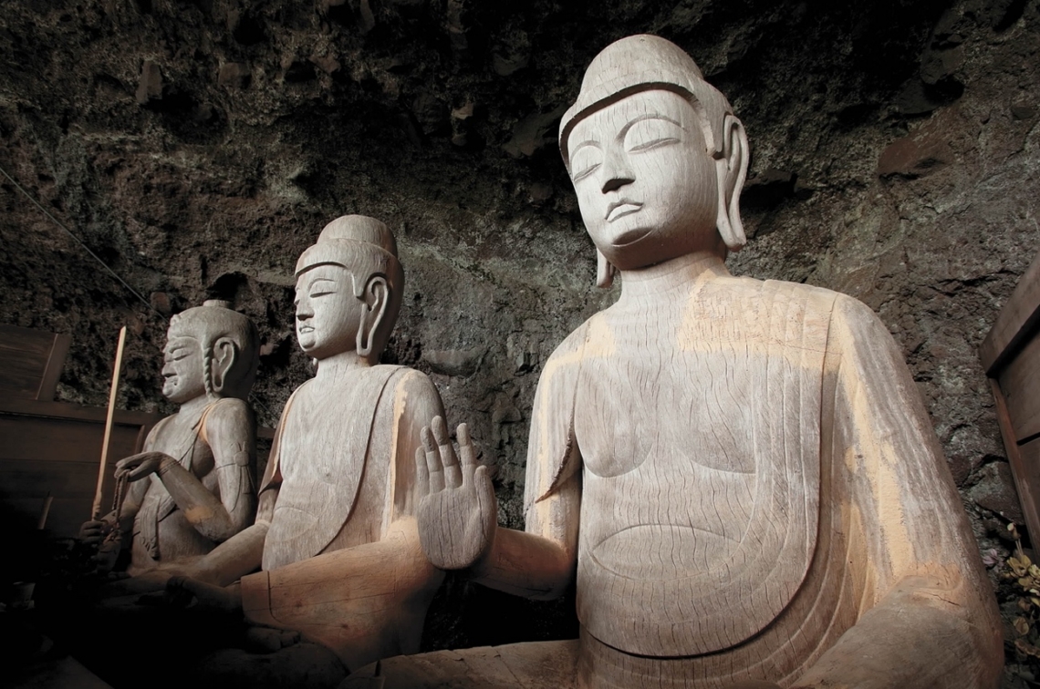 大きな岩窟(がんくつ)に、まるで投げ込まれたかのような懸造(かけづく)りの小さな礼堂(らいどう)。龍岩寺奥の院である。内部に入ると、素木(しらき)の3体の仏像が浮かび上がるかのような姿で訪れる人を迎える。思わず目をつむってぬかずきたくなる...