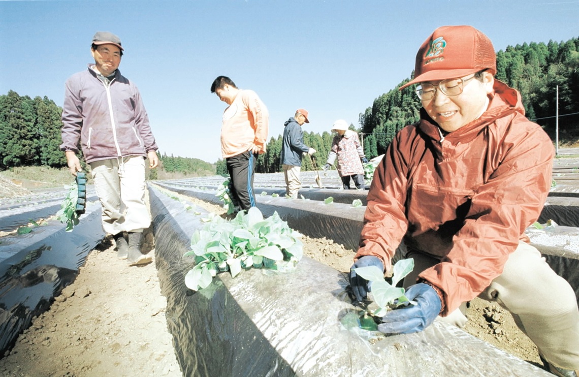 3月下旬、竹田市宮砥地区の滝部集落で、葉タバコの植え付けが始まった。安達智徳さん(48)方では、妻の由美子さん(44)、父親の博文さん(68)、母親のミエ子さん(68)、それに長男の一徳\さん(19)ら家族8人が畑に出た。智徳さんが植え付...