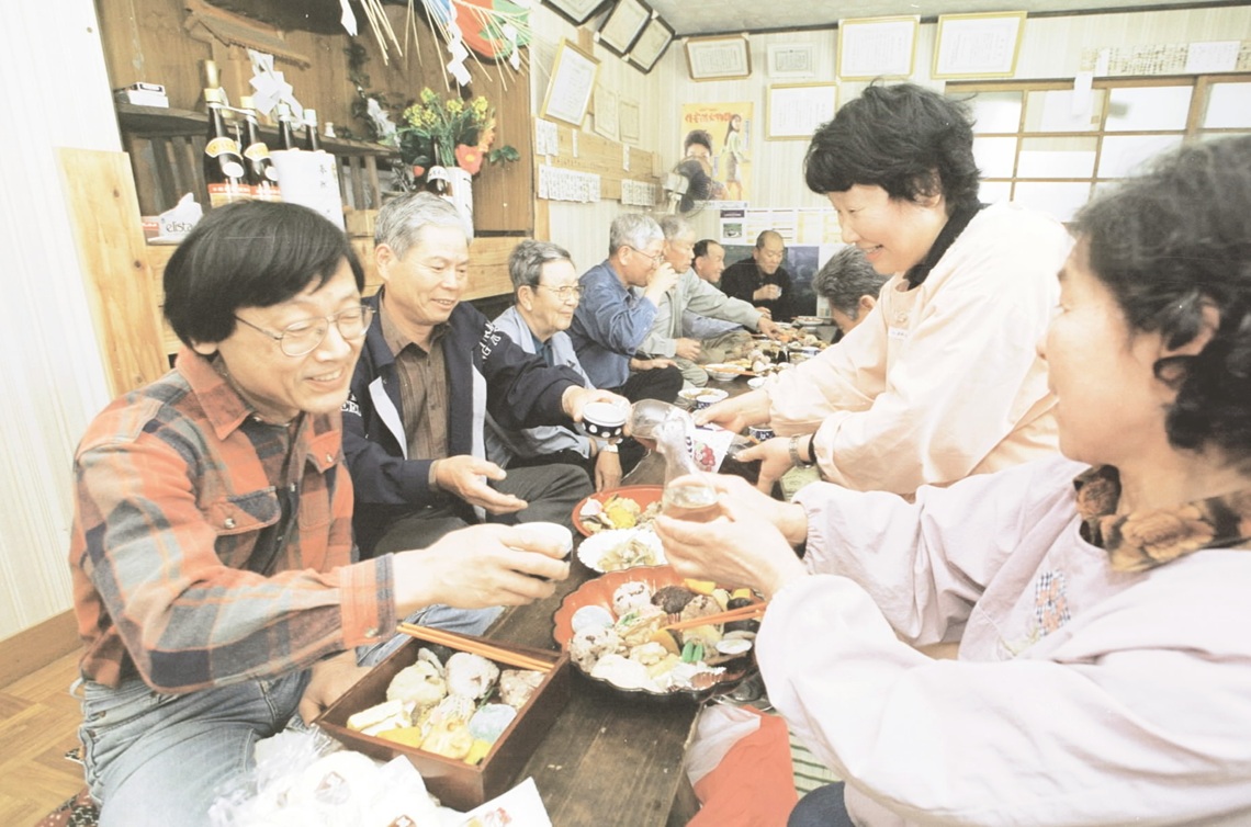 ヨモギもち、おはぎ、巻きずし、フキノトウのてんぷら、シカ刺し、シシなべ……。3月20日午後、竹田市宮砥地区の滝部公民館で、「お接待」が始まった。テーブルの上は、地区民が持ち寄ったごちそうでいっぱいだ。料理の材料は地元で取れたものばかり。「...
