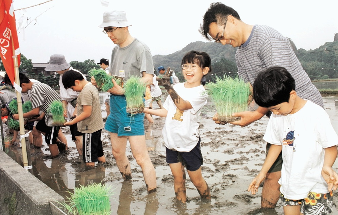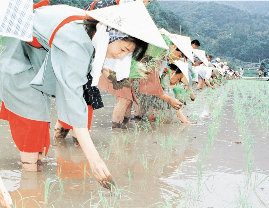 小崎の谷にホラ貝が鳴り響いた。かすりの着物の早乙女、Tシャツの若者や家族があぜに並んだ。6月10日、小崎の水田で御田植祭(おたうえさい)が始まった。「700年前の景観が残る荘園の里で田植えをしませんか」。こんな呼び掛けで集まった都市住民は...