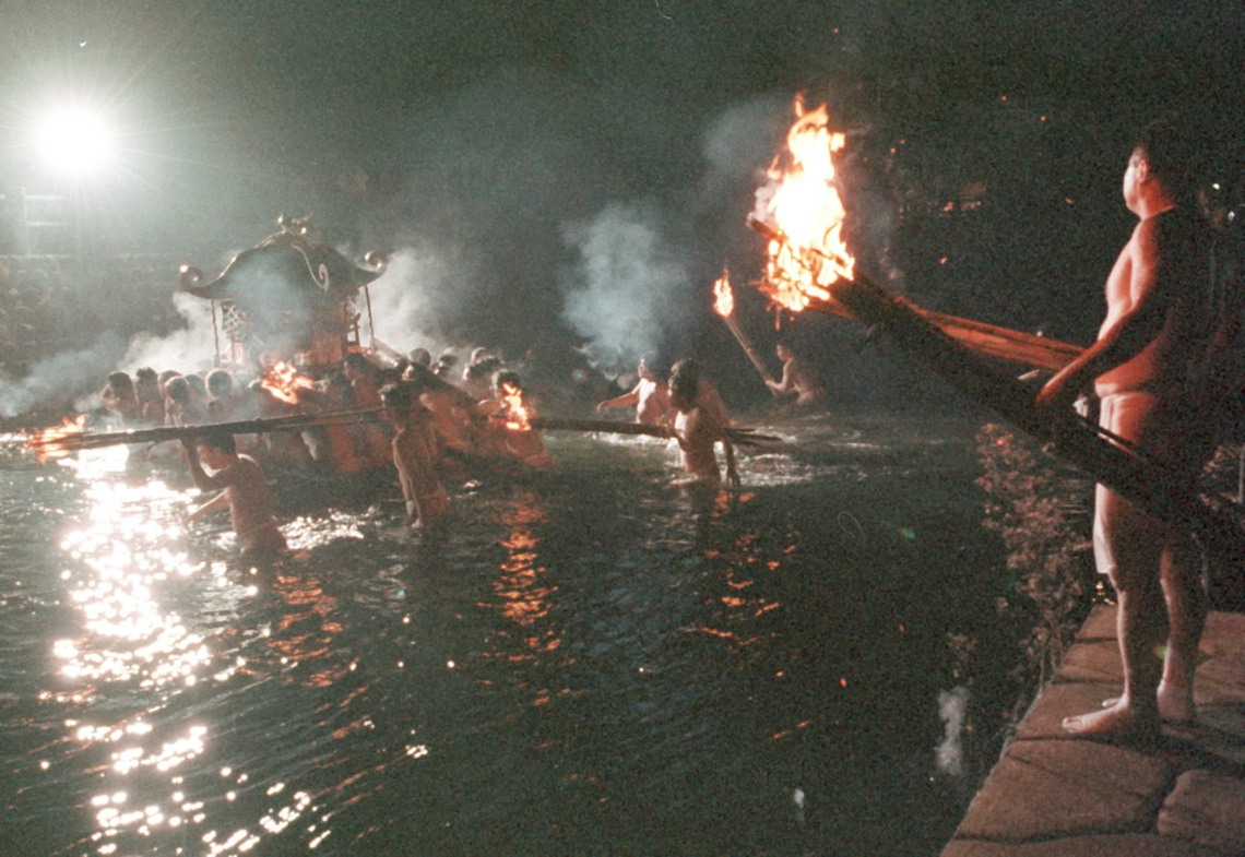 みこしが闇(やみ)に浮かんだ。たいまつが夜を照らした。「えいさ、えいさ」。ふんどし1本に、白足袋の男衆の掛け声が響いた。原尻の滝のごう音が後に続いた。 11月24日、緒方町で「川越し祭り」があった。1年に1度、緒方平野の西端、原尻の滝...