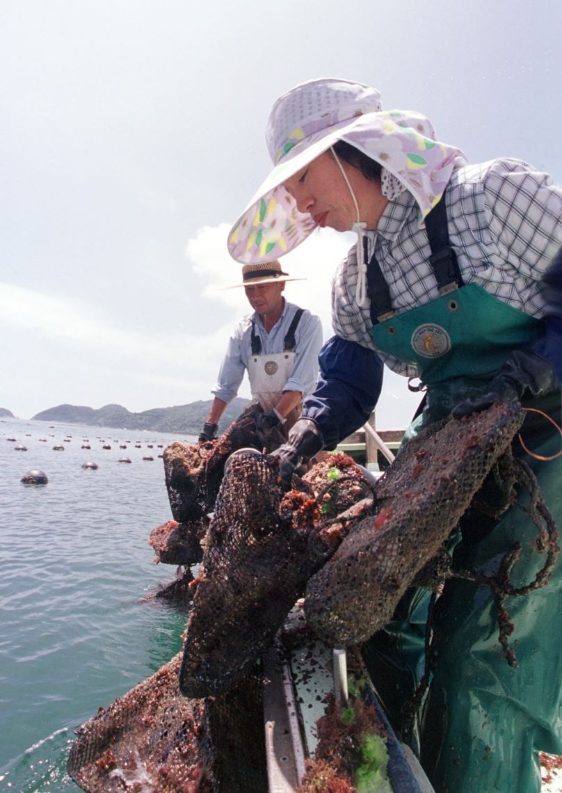猪串浦から船で5分の入り江に、宮脇真一さん(49)の養殖漁場がある。いかだの上には宮脇さんと妻の八重子さん(48)。毎日、海の上で共働きだ。 いかだから、海中に下ろした網にはヒオウギ貝がぎっしり。「出荷できる時が何よりもうれしい。子育...