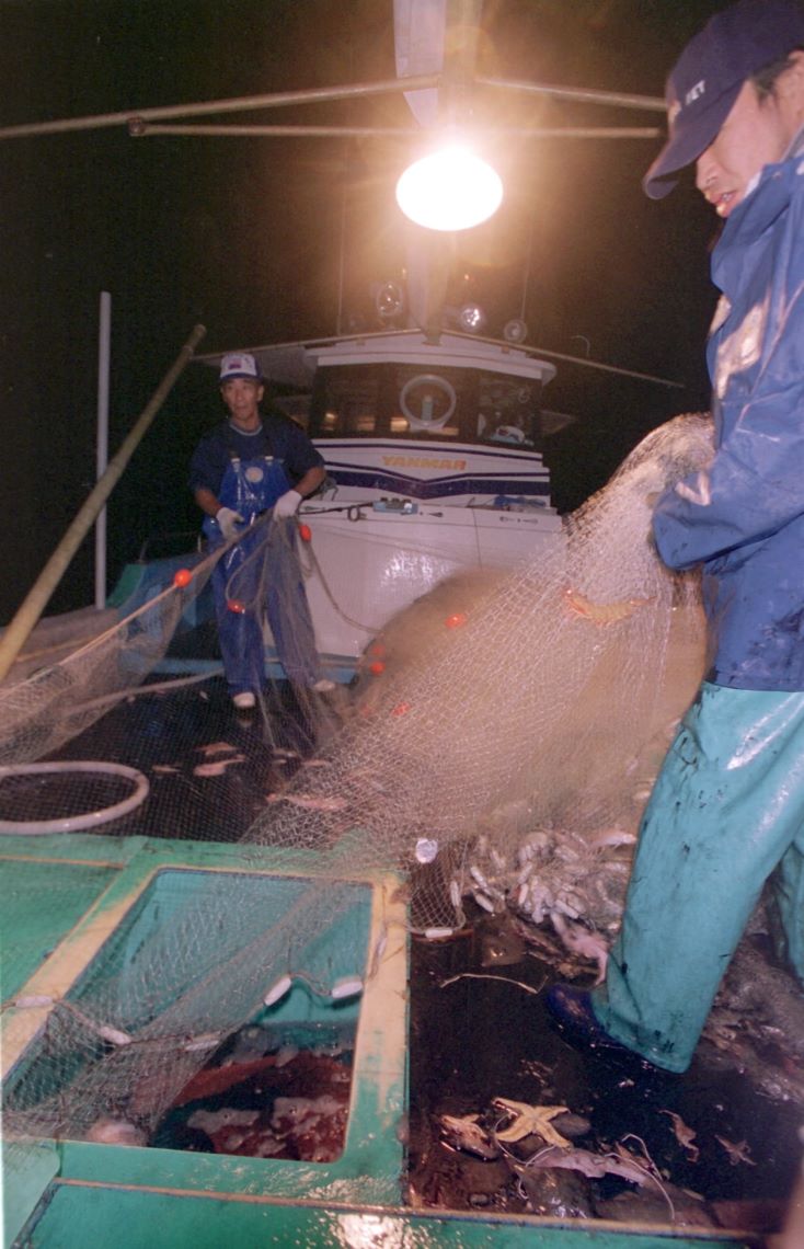 遠くに、別府のきらびやかなネオンが見える。幻想的な風景だ。3月下旬、夜半から小雨が降ったりやんだりの天気が続いていた。午前4時半、私たち撮影スタッフは日出町深江の漁業上野源三郎さん(65)、タミエさん(60)夫婦の船に乗っていた。 別...