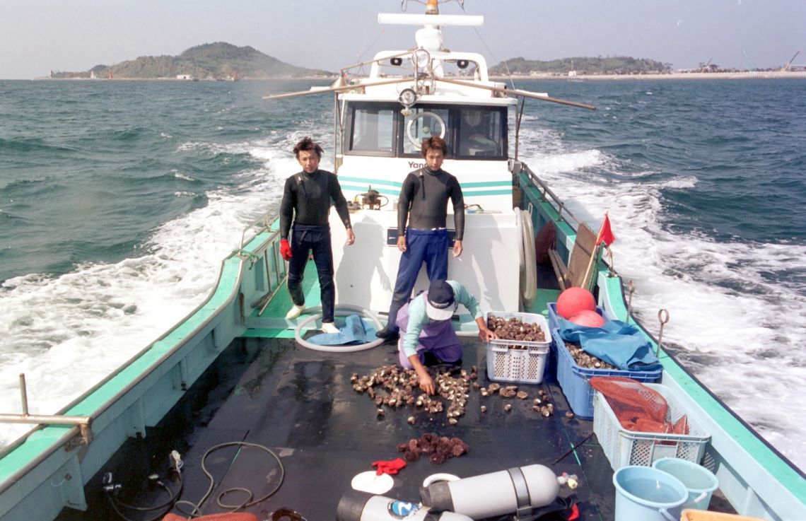 10月1日、姫島のサザエ潜水漁が解禁日を迎えた。漁船34四隻が沖合の漁場にひしめく。大海(おおみ)地区の大海(だいかい)藤雄さん(55)の藤吉丸(4t)から、長男英勝さん(26)、二男吉喜さん(24)が潜水器具を付けて海に飛び込んだ。父親...