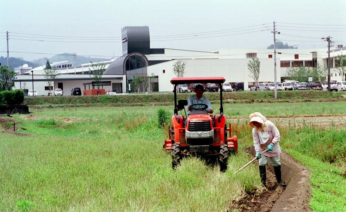 田んぼの向こうにカラフルな建物が見える。鉄筋コンクリート2階建て(延べ約1万3千平方m)、ガラスをふんだんに使った壁面。「病院と言えば箱形の建築物ですが、この病院は横に長い構造。病院らしくない病院と言ったらいいでしょうか」 緒方町の公...
