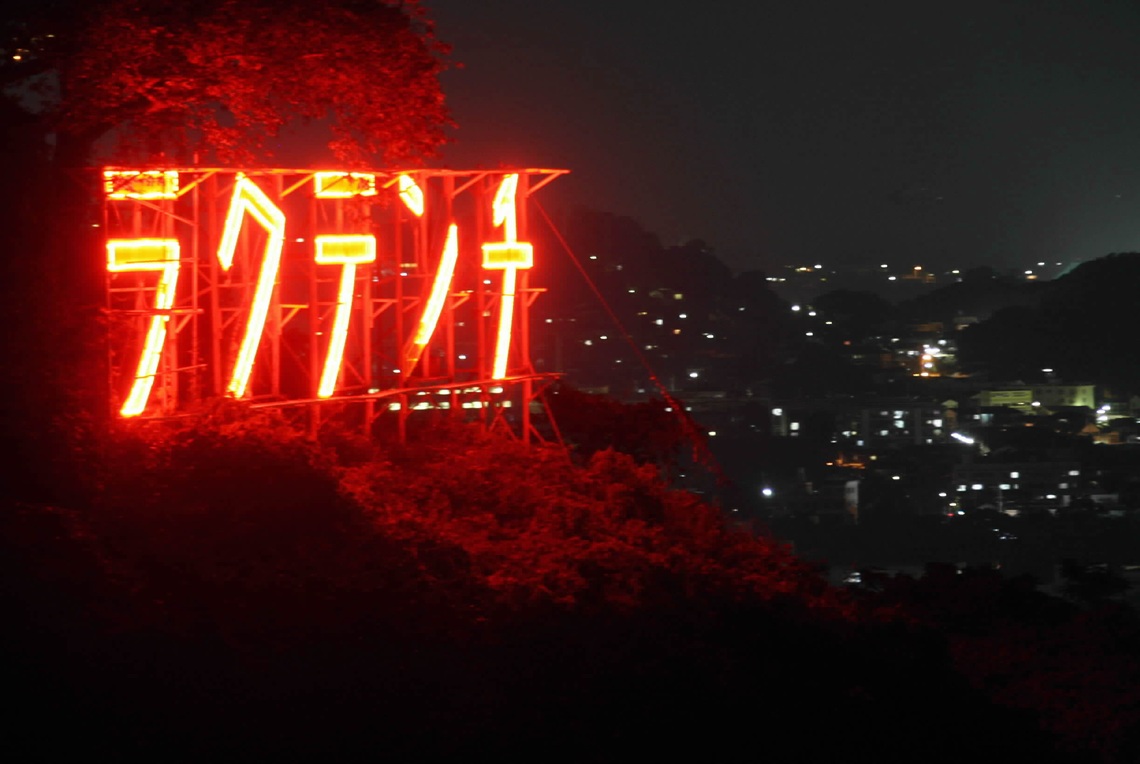 < ラ・ク・テ・ン・チ > 1つずつ区切るように浮かんでは、パッとなくなる赤い文字。1文字は4・6m四方。夏は午後8時、冬は午後7時からの3時間、点滅を繰り返す。 休園中は消えていた。泉都の人々はネオンを見上げ、ラクテンチが“帰っ...