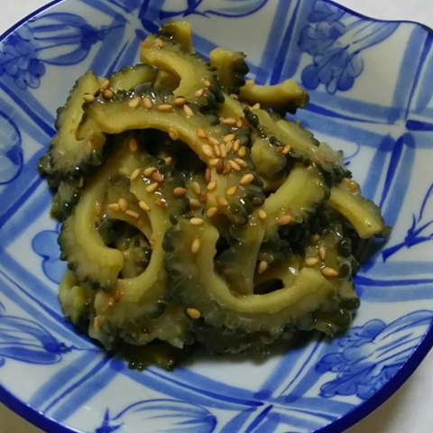 ゴーヤのごまドレッシング和えです。ゴーヤ嫌いのひとが「これなら食べられる」と、言ってくれました。お酒のおつまみにも合いますよ‼