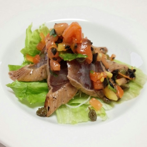 戻りガツオとフレッシュトマトのプッタネスカ 食べる直前にもオリーブオイルをふりかけていただきました。 鰹の食べ方、また増えました!