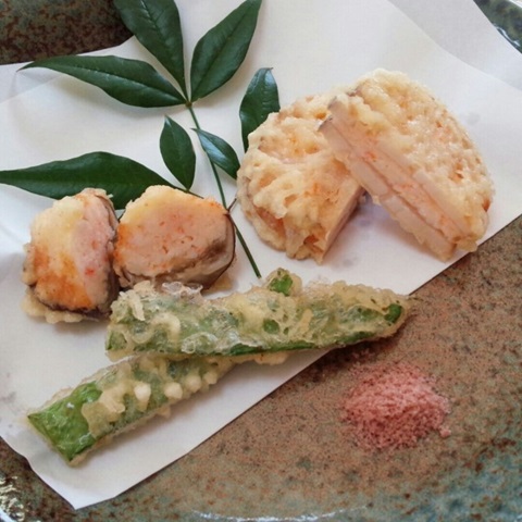 エビレンコンのはさみ揚げ エビしいたけも作ってみました。インゲンも揚げて添えてました。エビ好きにはたまりませんね。