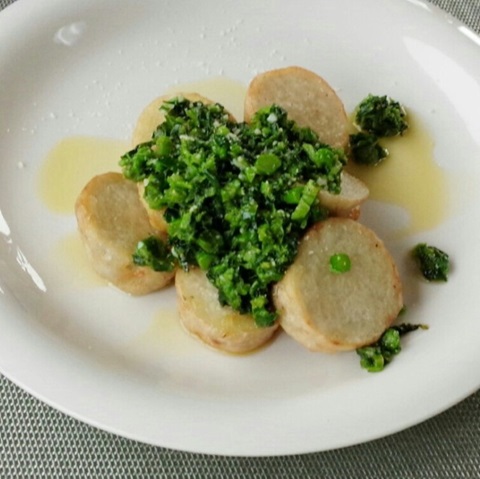 里芋のセモリナ粉フリット、菜の花ソ ース 揚げた里芋が美味しい。 菜の花ソースで春を感じます。