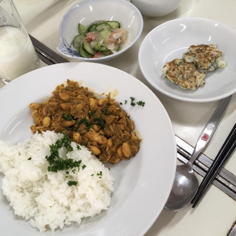 調理実習作品です。鯖缶、大豆のカレー、梨のすりおろし酢の物、山芋の落とし焼き。