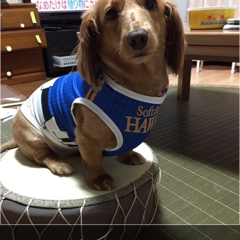 ソフトバンクのユニフォームを着たさくらちゃんです。