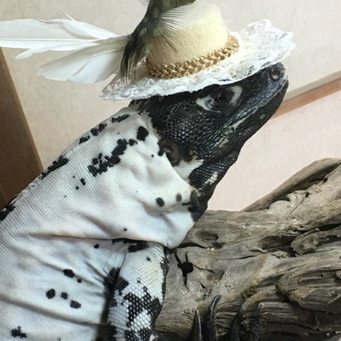 白黒パンダ模様の女の子 ルビーさんです。 チンゲンサイやトマト・バナナが大好物。 背中を優しく撫でられるのが大好き。 チョットいたずらして お帽子かぶせてみました 宝塚?(笑)