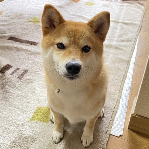 飼い主の朝食のパンを狙っている柴犬