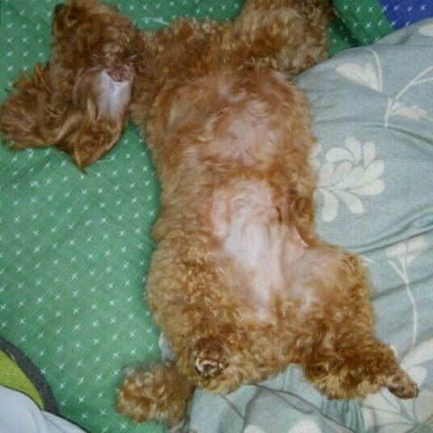 散歩で疲れて爆睡中、恥ずかしいワン