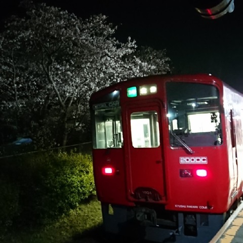 列車の灯りに照らされた桜