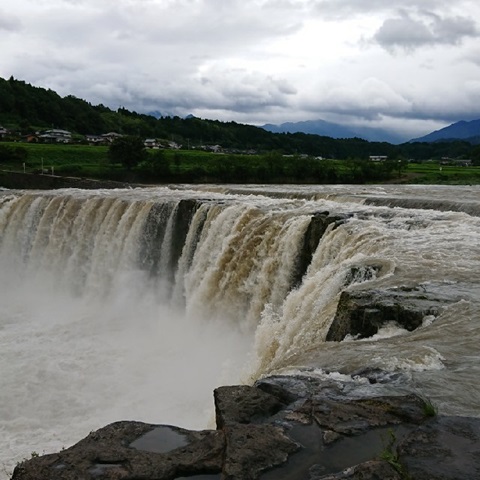 雨上がり、増水で迫力満天の原尻の滝