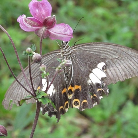 ピンクの秋明菊を撮っていたら目の前にアゲハ蝶がとまってくれました。