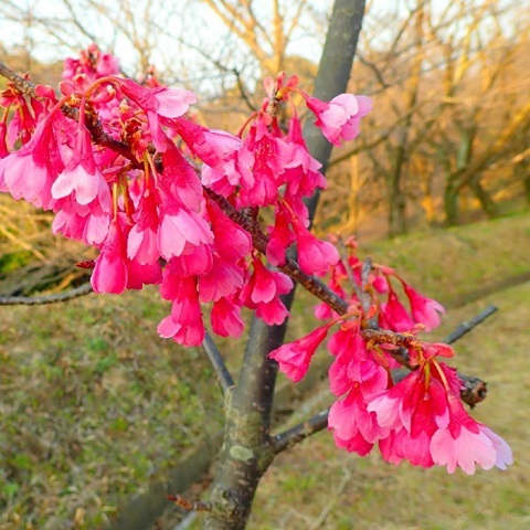 高尾山公園の寒緋桜 濃いピンク色、鮮やかです