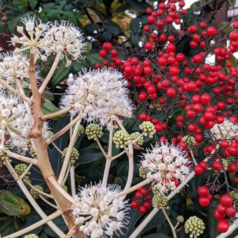 めでたい紅白 南天の実と八手の花